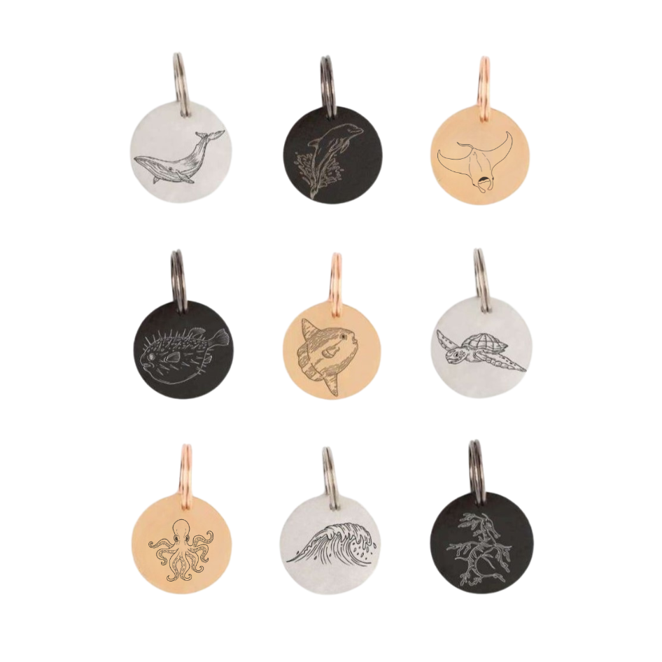 Vous pouvez choisir parmi ces motifs : poisson-globe, poisson-lune, nautile, raie manta, pieuvre, dragon de mer, dauphin, tortue, baleine, étoile de mer ou vague. Au dos de chaque pendentif, vous trouverez notre logo BRACENET.